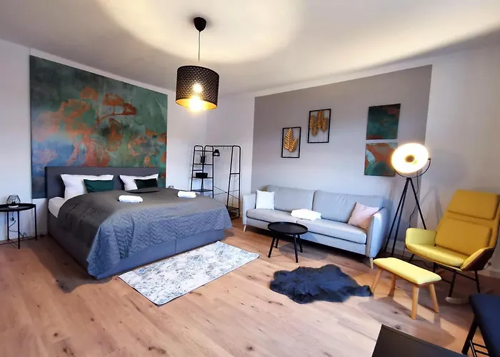 Bohnapartments Ega Stadtblick - Garten - Wlan - Naehe Theater Ega Und Messe appartement biedt gasten het gemak van zelfvoorzienende faciliteiten, waaronder een koffie/theezetapparaat, een oven en keukengerei. Gothaer Platz bushalte is op 400 meter afstand van Bohnapartments Ega Stadtblick - Garten - Wlan - Naehe Theater Ega Und Messe appartementen verwijderd.